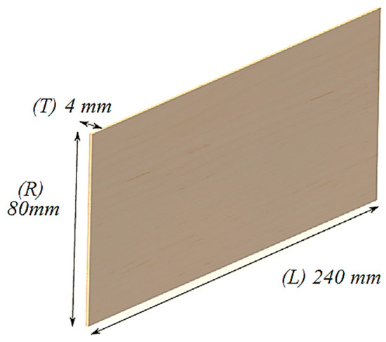Spruce (Picea abies Karst L.) and maple (Acer pseudoplatanus L.) wood specimens were included in the tests, with dimensions 80 × 4 × 240 mm3 corresponding to the radial × tangential × longitudinal directions, which were tested (according to ISO13061-1:2014/Amd1:2017 [30]) under laboratory conditions (20 °C and relative humidity (RH) of 65%). In Figure 1, the geometry and physical aspects of the samples are presented. From the point of view of the anatomical structure of the wood, two quality classes were analyzed: class A representing wood with a fine anatomical structure, with narrow and regular annual rings (for spruce wood) and wavy fibers (for maple wood), and class D representing wood with a coarser anatomical structure, with annual rings wider and irregular in width (for spruce wood) without wavy fibers (for maple wood) [10,23].