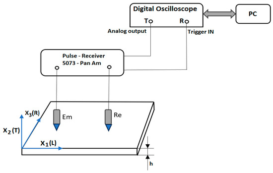 A problem associated with the propagation of Lamb waves is the coexistence of several modes of oscillation in the plate, which leads to difficulties in interpreting the results. The higher-order modes of oscillation start to propagate when the thickness of the plate becomes comparable to the wavelength of the longitudinal and transverse waves. Lamb waves are guided elastic plate waves that can be described as a combination of compression waves (P-waves) and shear waves (S-waves) [22,42]. For the excitation of Lamb waves in the lowest mode, transducers with Hertzian contact are used. A diagram of the system that generates and detects the Lamb waves for measurement is presented in Figure 2.