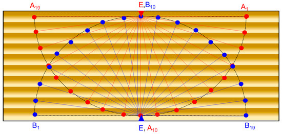 The signals emitted by the transmitter positioned at point E (Figure 3) were successively measured at points B1–B19 and A1–A19 as points on a semicircle, located at an interval of 10 degrees and a radius of 70 mm. The triangle symbol in points denoted E represents the position of the transmitter, and the circle symbol arranged in the form of a semicircle or quarter circle represents the successive position of the receiver. In order to avoid the dissipative behavior of the Lamb waves in the wood specimens, an equidistant distribution of the position of the transducers was chosen so that the effect of the anisotropy of the wood structure could be highlighted [18,27,28,29].