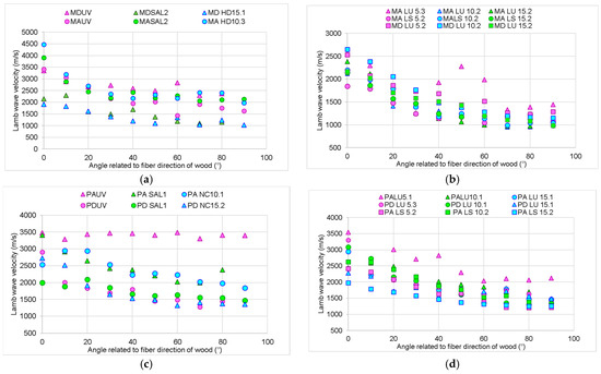 The variation in Lamb wave velocity in wooden plates with fiber angle variations: (a) spruce wood sample untreated, UV aged, and salt fog exposed; (b) spruce wood sample finished with oil-based varnish and spirit varnish; (c) maple wood sample untreated, UV aged, and salt fog exposed; (d) maple wood sample finished with oil-based varnish and spirit varnish.