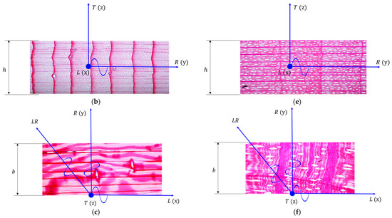 The microscopic views of the main section of wood related to the Lamb wave direction in the studied plates: (a) tangential section of spruce wood; (b) cross-section of spruce wood; (c) radial section of spruce wood; (d) tangential section of maple wood; (e) cross-section of maple wood; (f) radial section of maple wood.