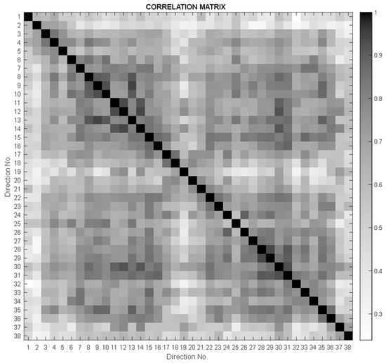 In order to verify the continuity of the measurement points, a correlation analysis of the values collected for all material samples was performed, considering the values measured on the two semicircles A and B as forming a fictitious circle. In the correlation matrix in Figure 8, a “butterfly” distribution of correlation values can be observed, with a diagonal symmetry that corresponds to the orientation symmetry of the wood fibers.