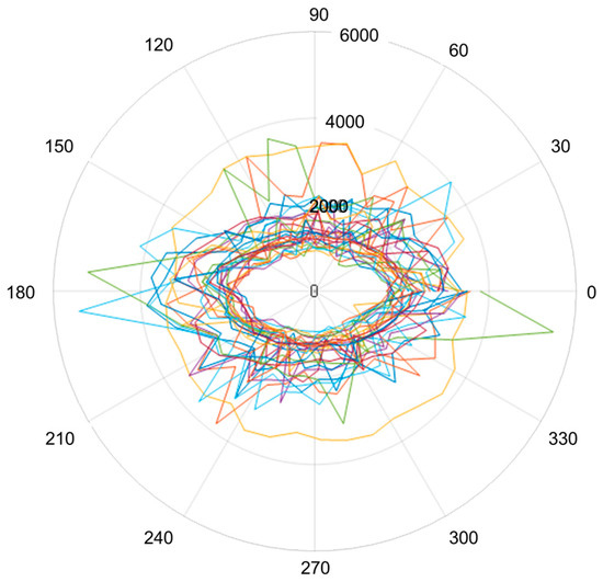 The anisotropy of the sound propagation speeds in the wood samples is highlighted in the polar graph of the speeds in each of the 38 directions for all of the wood samples (Figure 9).