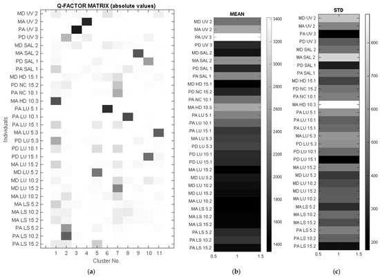 This summary shows the variability of the measured values with respect to the different directional dependencies, as well as the relatively large variation in the maximum speed measured in individual samples. Using the Q-variant of FA (based on a transposed data matrix and resulting in a clustering scheme, see the left part of Figure 8), it was possible to point to certain samples that had a particular pattern of anisotropy. Based on the Q-factor analysis (QFA), several groups of samples with similar anisotropy were extracted, depending on the wood species, the applied treatment, or the anatomical characteristics. In some of these groups, only a specific sample belongs to a cluster and therefore can be declared exceptional in its own way. These selected samples are due to the type of wood and different treatment methods. Using QFA, the measured parameters are ordered into a so-called individual profile, which helps to identify similar characteristics. By applying the RMS (the square root of the mean square) and STD (the standard deviation) complementary diagrams, it was found that the PA UV3 sample appears as a very unique sample with only one large affiliation (the dark highlighted value in Figure 10a) in the third group. This is a sample with a very high mean velocity (Figure 10b) and, in contrast, a small anisotropy (low STD value—Figure 10c). PD sample SAL1 has a similar small anisotropy. However, it does not have such high speeds and therefore represents a specific type in itself, defining another cluster, number 10. The sample MA HD10.3, which has an exceptional anisotropy (see the maximum measured standard deviation), defines cluster 1, to which samples such as PD LU5.3, PA SAL1, and several others with less similarity are assigned. Based on the above, several samples can be identified that are representative of “their” characteristic group. These are as follows: MA HD 10.3, PA LS 10.2, PA UV 3, MA UV 2, PA LU 5.1, PA LU 10.1, MA SAL 2, and MA LU 5.3. Cluster No. 7 is interesting in this respect, where two very similar velocity profiles are obtained from different wood species (Maple PA NC 10.1 and Spruce MD LU 15.2).