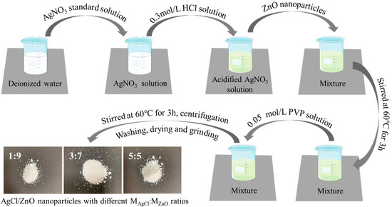 Next, 0.1112 g of PVP was dissolved in 20 mL of anhydrous ethanol to form a 0.05 mol/L PVP solution as the cementing agent for ZnO and AgCl. Afterward, 30 mL of a 0.1 mol/L AgNO3 standard solution was transferred into a beaker that held 10 mL of deionized water. The solution was mixed thoroughly until it was clear and colorless. After that, 10 mL of a 0.3 mol/L HCl solution was slowly introduced into the beaker, and stirring continued with a magnetic stirrer for 2 h at room temperature. To the acidified AgNO3 aqueous solution, ZnO nanoparticles (0.243 g, 0.567 g, and 2.187 g) were added, and the solution was stirred at 60 °C for 3 h. Finally, 10 mL of a 0.05 mol/L PVP solution was added to the mixture and stirred continuously at 60 °C for 3 h. The thoroughly mixed suspension was centrifuged at a rate of 4000 r/min, and the precipitate was washed three times with water and ethanol. Afterwards, the sediment was transferred into a vacuum drying oven and heated to 60 °C for 12 h. After cooling, the dried precipitate was ground to obtain composite nanoparticles of AgCl/ZnO with different molar ratios (MAgCl:MZnO = 1:9, 3:7, and 5:5). A schematic diagram illustrating the process of preparation is shown in Figure 1.