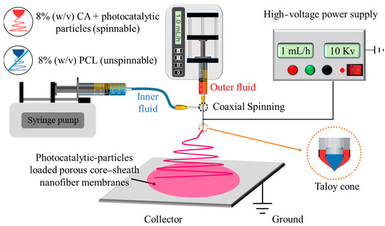 Porous nanofibers have high specific surface areas, making them ideal carriers for photocatalysts [22,23,24,25,26]. However, such porous structures may reduce the mechanical properties of fibers. Nanofibers that are prepared using coaxial electrospinning technology, featuring both a core–sheath structure and a porous sheath layer, exhibit outstanding mechanical properties and a high specific surface area, effectively overcoming the limitations of conventional porous nanofibers.
