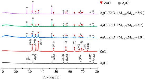 ” match the standard data of ZnO (JCPDS card No. 36-1451) and AgCl (JCPDS card No. 31-1238), respectively [27]. The characteristic peaks of AgCl and ZnO can be identified in the series of AgCl/ZnO NPs, with no other crystallization peaks present, indicating the high purity of the AgCl/ZnO NPs. This is because the AgCl and AgCl/ZnO NPs in this work were prepared under dark conditions, so there was no reduction or a minimal reduction of AgCl. As shown in Supplementary Figure S1, the XRD spectrum of zinc oxide remained largely unchanged after the photocatalytic reaction. However, a crystalline peak with a position at 38.8, which corresponds to the standard data of silver (JCPDS card No. 04-0783), was identified within the AgCl and AgCl/ZnO NPs after the photocatalytic reaction. These data demonstrate the decomposition of silver chloride during the photocatalytic process.