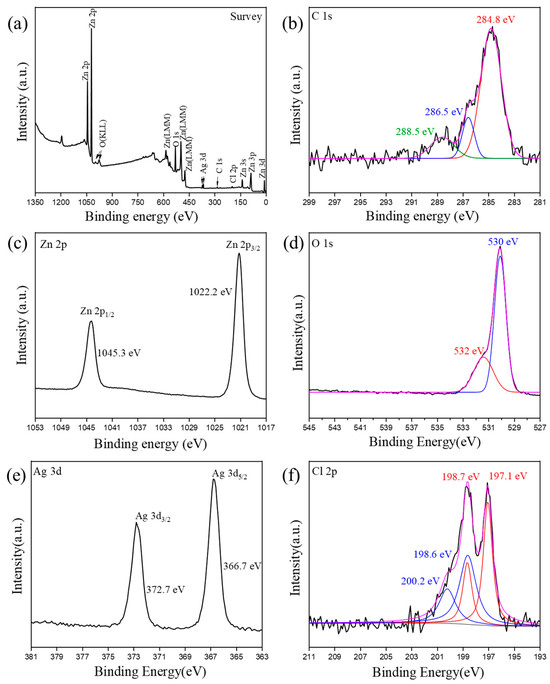 XPS spectrum of AgCl/ZnO NPs (MAgCl:MZnO = 5:5): (a) survey, (b) C 1s, (c) Zn 2p, (d) O 1s, (e) Ag 3d, and (f) Cl 2p.