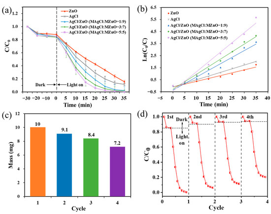 (a) Photodegradation activity and (b) corresponding first-order kinetic fitting curves of different photocatalytic NPs toward MB under simulated solar light irradiation. (c) Mass and (d) photocatalytic performance of AgCl/ZnO (MAgCl:MZnO = 5:5) after each cycle.
