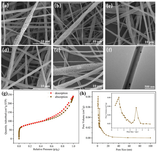 (a–e) SEM images of F1–F5, (f) TEM image, (g) nitrogen adsorption–desorption isotherm, and (h) pore size distribution curve of F5.