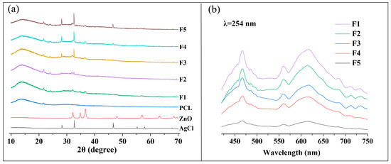(a) XRD patterns of PCL, AgCl NPs, ZnO NPs, and nanofiber membranes F1–F5 and (b) photoluminescence spectra of nanofiber membranes F1–F5.