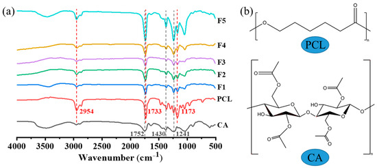 (a) FTIR spectra of the raw materials PCL and CA, and nanofiber membranes F1–F5. (b) Molecular structures of PCL and CA.