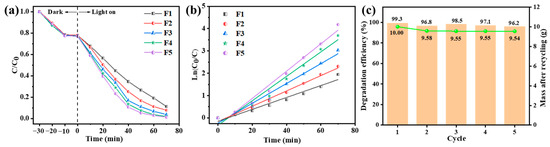 (a) Photodegradation activity, (b) corresponding first-order kinetic fitting curves of MB under simulated solar light irradiation of F1–F5, and (c) cyclic experiment on F5.