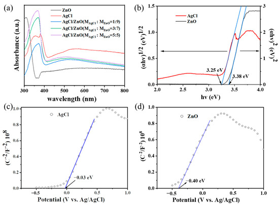 (a) UV–visible absorption spectra of AgCl NPs, ZnO NPs, and AgCl/ZnO NPs. (b) Tauc curves of ZnO NPs and AgCl NPs. Mott–Schottky curves of (c) ZnO NPs and (d) AgCl NPs.