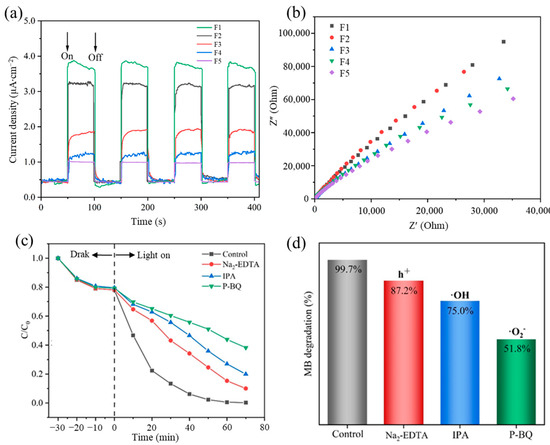(a) Transient photocurrent responses of F1–F5 under simulated solar light irradiation. (b) Electrochemical impedance spectra of F1–F5. (c) Free radical trapping experiment on F5 under simulated solar light irradiation. (d) Degradation efficiency of MB after the addition of free radicals.