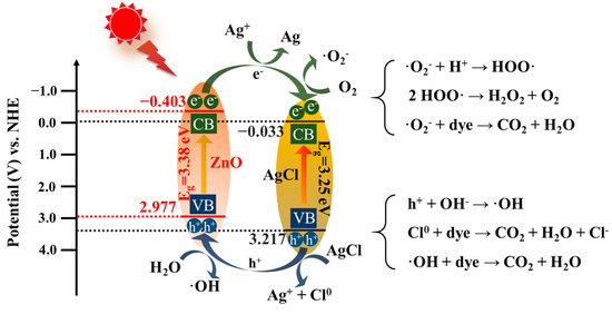 The photocatalyst was in an excited state under simulated solar light irradiation. The electrons (e−) in AgCl and ZnO underwent a transition from the VB to the CB, leaving corresponding holes in the VB. At this point, the CB potential of AgCl was more positive than that of ZnO, so electrons from the CB of ZnO transitioned to the CB of AgCl and gradually accumulated. Based on the above analysis, a photocatalytic mechanism was proposed in Figure 13. Firstly, under UV light irradiation, photogenerated electron–hole pairs (e−–h+) were formed in ZnO NPs. AgCl decomposes under light to produce Ag, which absorbed UV light, and generated Ag+ and e−. Secondly, some e− from the CB reacted with Ag+ to form Ag and the other e− were expected to be trapped by O2 in solution to generate ·O2− and other oxygen species like HOO· and H2O2. The generated radicals can react with dyes [40]. Thirdly, the h+ could react with AgCl to form Ag+ and Cl0, and a part of h+ generated by ZnO reacted with H2O to form ·OH. The Cl0 and ·OH could also react with the dyes. Through the synergistic action of ·O2−, ·OH, h+ and Cl0, the MB were degraded into CO2 and H2O.