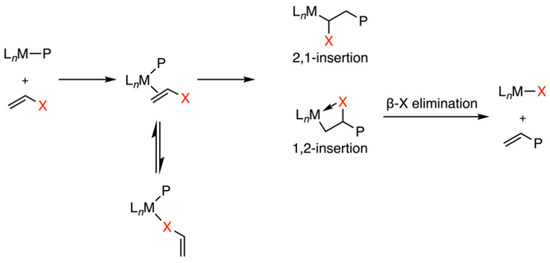 Polyolefins stand as a predominant class of plastics, constituting over half of the global plastic production at 360 million tons, playing an important role in modern society [1]. The incorporation of polar functional groups is an effective method to enhance surface properties, thereby widening their range of potential applications [2,3,4,5,6]. Transition-metal-catalyzed copolymerization emerges as a direct and cost-effective method for producing functionalized polyolefins under mild conditions [7]. However, Ziegler–Natta catalysts and metallocene-based catalysts encounter some challenges in ethylene copolymerization related to the poisoning of the metal center (Figure 1) [8,9]. These challenges could come from the deactivation of the Lewis acidic metal center, particularly due to the coordination with Lewis basic polar groups. Furthermore, 2,1-insertion may lead to the formation of stable metal–alkyl chelates, followed by β-X elimination, inhibiting the further insertion. Due to the weaker Lewis acidity and lower oxophilicity, late transition metal catalysts, such as Pd- and Ni-based catalysts, exhibit better tolerance of functional/polar groups, thus having been employed in ethylene copolymerizations for synthesizing polar polymers.