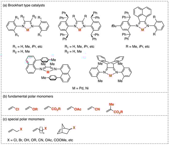 (a) Structures of Brookhart’s Pd and Ni α-diimine catalysts. (b) Fundamental polar monomers used in copolymerization reactions. (c) Special polar monomers used in copolymerization reactions.