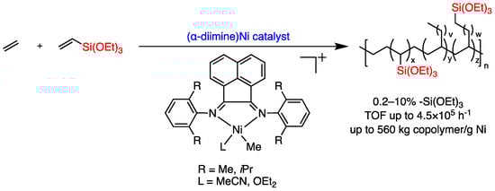 - Chen, Z.; Leatherman, M.D.; Daugulis, O.; Brookhart, M. Nickel-Catalyzed Copolymerization of Ethylene and Vinyltrialkoxysilanes: Catalytic Production of Cross-Linkable Polyethylene and Elucidation of the Chain-Growth Mechanism. J. Am. Chem. Soc. 2017, 139, 16013–16022. [Google Scholar] [CrossRef] [PubMed]