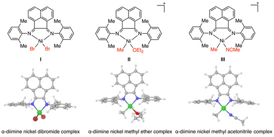 As reported in the previous study [28], the ethylene polymerization was catalyzed by α-diimine Ni catalysts. The α-diimine nickel dibromide complex I, the cationic and α-diimine nickel methyl ether complex II, and the nickel methyl acetonitrile complex III were regarded as the initial Ni complexes and active cationic active species, and thus were optimized by DFT calculations (Figure 4). Optimized structures exhibited distinct geometrical characteristics, where the Ni(II)Br2 complex I showed tetrahedral conformation while the Ni(II)(OEt)2 cationic complex II and the Ni(II)(MeCN)+ cationic complex III exhibited square planar conformations. Based on these optimized structures, ethylene polymerizations were investigated computationally in detail as follows.