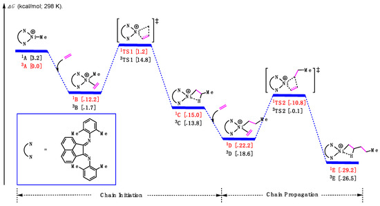 Based on previous studies [43,44], DFT calculations were conducted to explore the ethylene polymerization process, including both chain initiation and chain propagation. For all proposed intermediates and transition states, both singlet and triplet spin states were considered, and the lower-energy structures were identified and colored. As shown in Figure 5 (and Figure S1 in Supplementary Materials), starting with the cationic methylated α-diimine Ni complex 3A, one molecule of ethylene coordinated to the Ni center, forming the π-complex 1B and releasing an energy of 2.0 kcal/mol. Subsequently, the π-complex could undergo the first ethylene insertion via transition states 1TS1 with a barrier of 14.4 kcal/mol, leading to the chain initiation product 3C. In turn, the Ni-alkyl species will then be poised to coordinate the second ethylene molecule and undergo the second ethylene insertion via transition states 1TS2 to form the product 3E. Notably, the barrier for the chain propagation step was found to be 13.1 kcal/mol, lower than that of the first step, which suggests that the chain initiation is the rate-determining step in the ethylene homopolymerization catalyzed by this cationic α-diimine Ni complex.