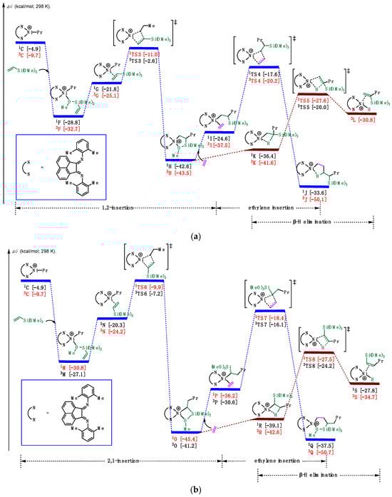 To obtain a comprehensive understanding of this reaction, we also considered the 2,1-insertion pathway (Figure 6b and Figure S2b in Supplementary Materials). Similar to the 1,2-insertion, starting from the coordination of 3C, the Ni(II) species 1N could undergo 2,1-insertion with VTMoS via 1TS6 (the barrier was 20.9 kcal/mol), leading directly to the four-membered chelate complex 1O, accompanied by the release of 14.6 kcal/mol in energy. The four-membered chelate complex 1O could also be detectable by the NMR spectrum [28], supporting the rigidity of the computational results. Then, excess ethylene could foster the ring-opening of 3H, and then another molecule of ethylene inserted into the Ni-C bond with a barrier of 27.0 kcal/mol, resulting in the six-membered chelate product 3Q. Additionally, from 1O, we located the transition state for β-H elimination, denoted as 1TS8, leading to the formation of the Ni(II)-H species 3S. Since the pathways and barriers were similar for both 1,2- and 2,1-insertion pathways, and the chelates could be found in experiments, it is obvious that both 1,2- and 2,1-insertion merged in this reaction, which is special and different from other catalysts.