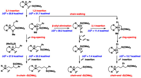 After the chain initiation step to form the Ni-alkyl species, we proceeded to explore the insertion of vinylalkoxysilane (Figure 6). As shown in Figure 6a (and Figure S2a in Supplementary Materials), based on the relative stability of π-complexes and O-complexes [45], the Ni-alkyl complex 3C coordinated with vinyltrimethoxysilane (VTMoS), releasing an energy of 23.0 kcal/mol to generate the O-complex 3F, which could equilibrate to the π-complex 3G. Then, 3G could undergo 1,2-insertion via 1TS3 with an overall barrier of 21.7 kcal/mol, leading to the formation of a Ni(II) five-membered chelate complex 3H (10.8 kcal/mol downhill in energy). Notably, the five-membered chelate complex could be isolated and identified successfully by the NMR spectrum [28]. In turn, excess ethylene induced the chelate opening of 3H, and then another molecule of ethylene inserted into the Ni-alkyl species with a barrier of 23.3 kcal/mol, resulting in the desired product 3J. Considering prior computational studies [43,45,46,47], we also investigated the commonly proposed chain termination pathway that β-H elimination. However, this pathway was found to be much lower in energy (~16 kcal/mol) compared to the 1,2-insertion. Despite this computational result, experimental results [28] supported the predominance of 1,2-insertion over β-H elimination. We attribute this observation to the excess ethylene favoring the chain propagation pathway over the chain termination pathway. And the small energetic difference among 3I, 3K, and 3H allowed for their mutual transfer, thereby giving the possibility of proceeding the chain propagation step.