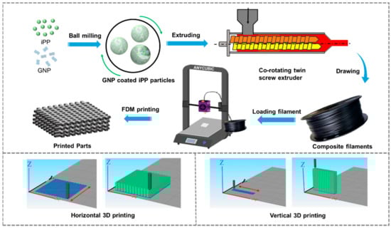 Schematic diagram of the fabrication of iPP/GNP composite filaments and their FDM process.
