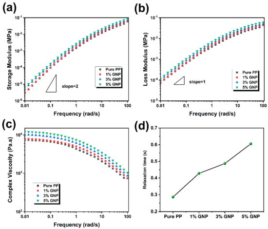 Rheological properties of iPP and iPP/GNP composites with various GNP contents: (a) Storage modulus, (b) Loss modulus, (c) Complex viscosity, and (d) Relaxation time.