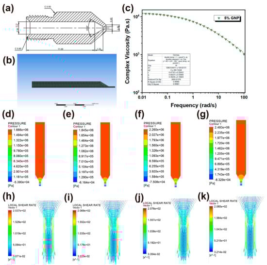 (a) cross-sectional view of the printing nozzle; (b) finite element meshing of two-dimensional nozzle model; (c) Carreau-Yasuda model for the parameters fitted to the iPP/GNP composites by taking 5 wt% GNP as an example; (d–g) Polyflow finite element simulation of pressure distribution within the cross-section of the nozzle for iPP, 1 wt% GNP, 3 wt% GNP, and 5 wt% GNP, respectively; (h–k) local shear rate distribution within the cross-section of the nozzle for iPP, 1 wt% GNP, 3 wt% GNP, and 5 wt% GNP, respectively.