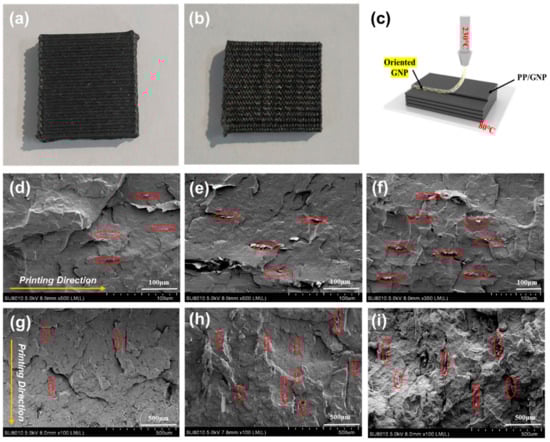 FDM printed parts of FP (a) and VP sample (b); GNP orientation behavior of iPP/GNP composites during FDM printing process (c); SEM results of various FDM printed parts (d) FP1, (e) FP3, (f) FP5, (g) VP1, (h) VP3, (i) VP5. The red circle represents the aligned GNP particles within iPP matrix.