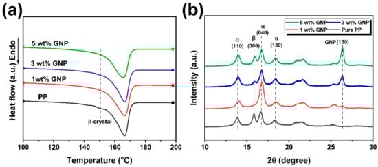 (a) DSC curves and (b) XRD pattern for iPP/GNP FDM printed parts with various GNP loadings.