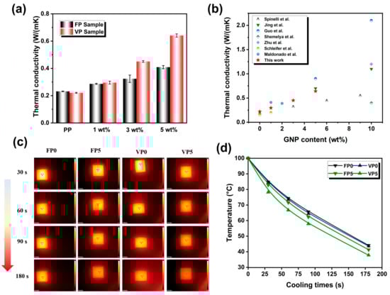 The anisotropic thermal conductivity of graphene nanoplatelets (GNP) can induce a corresponding anisotropy in the thermal conductivity of a polymer matrix. To evaluate the effect of the 3D printing construction method on the thermal conductivity of composites, the thermal conductivity through the thickness direction of the FDM printed parts was studied, as shown in Figure 6. As presented in Figure 6a, the inherent low thermal conductivity of neat iPP, coupled with the lack of oriented high thermal conductivity functional fillers in the matrix, resulted in a low thermal conductivity of 0.23 W/m · K and 0.22 W/m · K for FP0 and VP0, respectively. Conversely, the FDM-printed iPP/GNP composites exhibited a clear increase in thermal conductivity across both printing directions with the addition of GNP, escalating from 0.29 W/m · K of FP1 to 0.42 W/m · K of FP5 and from 0.30 W/m · K of VP1 to 0.64 W/m · K of VP5. Remarkably, the thermal conductivity of the VP samples surpassed that of the FP samples, a distinction particularly pronounced in the VP3 (0.46 W/m · K) and VP5 (0.64 W/m · K) samples, yielding an increase of approximately 109% for VP3 and 191% for VP5 compared to that of their FP samples, respectively. Notably, the VP5 sample achieved a thermal conductivity value of 0.67 W/m · K, which is comparable to the recently reported thermal performance of graphene composites fabricated by using 3D printing, as presented in Figure 6b. Thermal imaging was conducted to visually investigate the thermal conductivity differences of the FDM printed parts to observe the thermal diffusion behavior during heating and cooling cycles, as illustrated in Figure 6b. It was apparent that the tested sample temperatures declined at different rates, with VP5 and FP5 samples exhibiting a more rapid temperature drop over time compared to VP0 and FP0 samples during the heat dissipation process. The FP0 and VP0 samples presented the slowest temperature response, hindered by their inadequate heat dissipation capabilities, leading to the formation of hot spots at the center of the tested samples. As shown in Figure 6c, the temperature of FP samples dropped from 100 °C to 41.3 °C within 180 s, while the VP5 samples decreased from 100 °C to 37.8 °C, indicating enhanced heat flux diffusion and conduction efficiency of VP5. Overall, the infrared thermal images and corresponding temperature curves illustrated that the heat dissipation capacity among the printed parts arranged as VP5 > FP5 > VP ≈ FP.