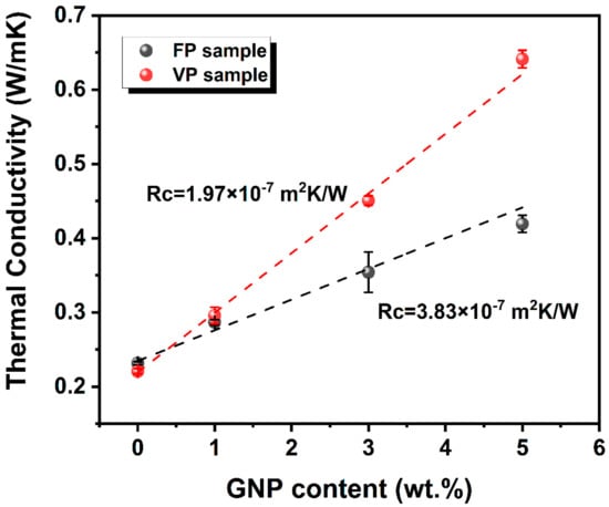 where , , and are the effective thermal conductivity of the polymer composites, neat iPP and the GNP filler, respectively. are the volume fraction of GNP within the composites, and represents the interfacial thermal resistance between GNP and the polymer matrix. Additionally, L and d are the lateral size and thickness of GNP, respectively. In this study, iPP was utilized as the matrix with a thermal conductivity of 0.22 W/m · K. The thermal conductivity of the GNP filler was established at 2000 W/m · K, with a lateral size (L) of 10 μm and a thickness (d) of 15 nm. Based on the above equations and the experimental measurement of , the fitting situation of values of the FP and VP printed samples are shown in Figure 7. It can be seen that the for the VP sample was calculated to be 1.97 × 10−7 m2 K/W, which was lower than that of the FP sample at 3.83 × 10−7 m2 K/W. This distinction implied that the VP samples benefited from a more thermally efficient interface, which could be well attributed to the alignment of GNP, which was more parallel to the heat conduction path, minimizing the scattering and disruption of heat flow across the interface.
