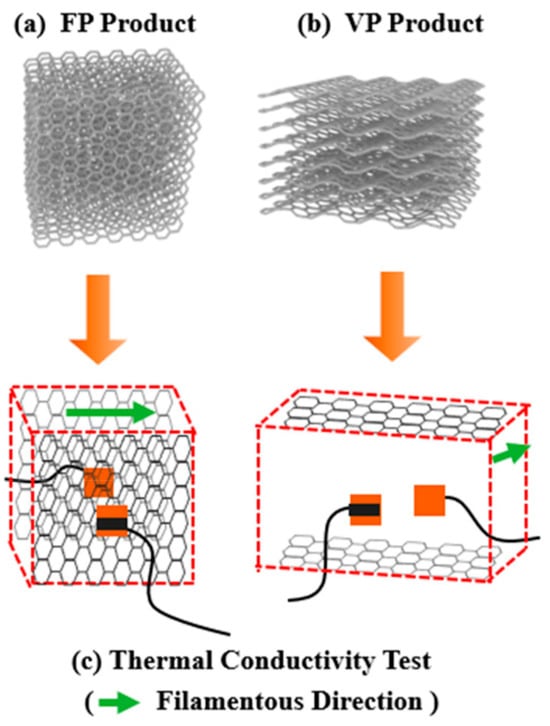 The mechanism of the difference in thermal conductivity between FP and VP of FDM printed parts is shown in Figure 8. In the situation of the FP sample, the heat flow produced by the heating device encountered blocks at each layer interface due to the vertical orientation of GNP with respect to the heat flow direction. More importantly, the heat flow conduction necessitated bridging the gap between two adjacent filaments within the printed parts, generating a significant interface thermal resistance and thus serving as a barrier to hinder the efficient conduction of phonons. This structure arrangement disrupted the thermal path continuity, leading to higher interfacial thermal resistance and lower overall thermal conductivity. However, as for the VP sample, the GNPs were aligned along the printing direction, which was also the heat flow direction, providing a continuous pathway for heat transfer and minimizing interruptions at printed layer interfaces, thus facilitating an efficient heat transfer. In this case, the superior in-plane thermal conductivity of GNP could be fully exploited, allowing for a more direct and shortened heat transfer path, as presented by the red arrow in Figure 8, thereby enhancing the overall thermal conductivity of VP samples.