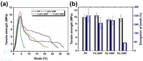 (a) Stress-strain curves and (b) tensile strength and elongation at break for printed samples of iPP/GNP composite with various GNP loadings.