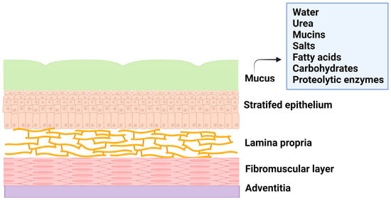 The female reproductive system is composed of the fallopian tubes, ovary, cervix, ectocervix, and vagina. The vagina is a distensible organ (~9 cm in length), which is characterized by a stratified epithelium, fibromuscular layer, lamina propria, and adventitia. The vagina is covered with cervical mucus which is composed of water (90%), urea, carbohydrates, mucins, fatty acids, proteolytic enzymes, and salts [5]. The consistency of cervical mucus and the thickness of the vaginal epithelium vary throughout the menstrual cycle and are regulated by hormones such as estrogen. The main functions of the mucus are to provide lubrication and protection against infections. The layers of vaginal tissue and compositions of mucus are illustrated in Figure 1.