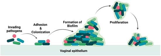 These pathogens thrive in the vagina by producing a biofilm that leads to the recurrence of the infection even after treatment [6,7], as the biofilm is an adaptation of the bacteria to resist any applied drugs and evade the immune system. The biofilm is composed of a group of pathogenic microbes adhered to one another on a surface that is, by extracellular polymeric substances, produced by the microbes. The formation of biofilm is illustrated in Figure 2. Biofilm is a physical barrier that limits the accessibility of drug molecules and enhances the thriving of pathogens. In this aspect, any drug formulation for vaginal delivery should not be harmful to the vaginal flora and its environment.