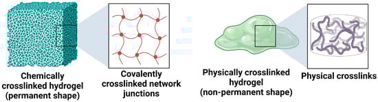 The chemically crosslinked hydrogels have permanent crosslink junctions through the formation of covalent bonds, while the physically crosslinked hydrogels have nonpermanent crosslink junctions that arise due to physical or secondary interactions. These interactions include polymer entanglements, ionic interactions, hydrogen bonding, and hydrophobic interactions [30]. The two types of hydrogels are illustrated in Figure 4.
