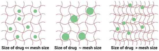 Illustration of transport of drugs from hydrogels based on the hydrodynamic radius of drugs and mesh size of the hydrogel matrix. The red lines are the polymer chains and the green spheres are the drug molecules.