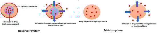 The drug concentration is highest close to the surface of the hydrogel matrix and decreases with the depth of the gel. When the liquid in the bulk is stirred, the value of drug concentration is constant. Exterior diffusion controls the rate of drug release only in exceptional cases. The rate of drug release depends on interior phenomena or interior diffusion. The interior diffusion is based on Fick’s law of diffusion, and two types of systems are recognized, such as the reservoir system and the matrix or monolithic system, as shown in Figure 7.