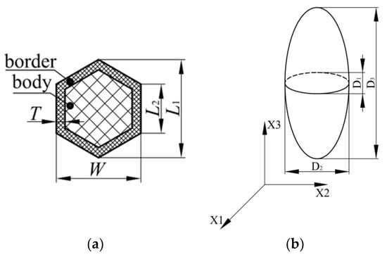 The closed-cell polyethylene terephthalate (PET) foam used in this work was manufactured by PolyCore Advanced Materials Co., Ltd in Huangshan, China. The honeycomb-shaped foam shown in Figure 1 was produced using the strand foam extrusion process. The die of the PET foaming extruder is a special multi-hole breaker plate [19,20], as discussed in the introduction. PET foam typically exhibits higher performance in the processing direction due to stretching during extrusion, compared to other directions. The strand consists of two parts: the high-density strand border and the low-density strand body (see Figure 2a) [20]. L1, L2, T, and W are the geometric features of the stand border. In Figure 2b, the extrusion direction is defined as X3, and the lowest performance is defined as X1. D1, D2, and D3 are the geometric features of the cell in the extrusion and lateral directions, respectively. The foaming process has been discussed in detail [19,20], and four different densities of PET foam, namely YD100, YD150, YD200, and YD320, are investigated in this work. The relevant information is shown in Table 1.