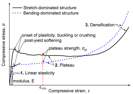 n will be close to 1 if the cell wall’s axial compression or stretching are the main deformation mechanisms (e.g., buckling of cell walls); if the cell wall’s bending is the main deformation mechanism, n approaches 2 [29,45]. Stretch-dominated structures usually undergo initial yielding, followed by local brittle collapse or plastic buckling of the cell structure. This revealed the post-yield softening phenomena in their stress–strain response (see Figure 3) [20,29].