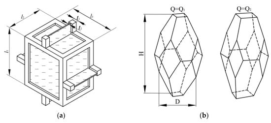 The model proposed by Gibson and Ashby oversimplifies the cell structure of real foam, leading to significant discrepancies between the model’s predictions and experimental results [2,30,31,32,33]. To improve the precision of the model predictions, Sullivan et al. have refined the Kelvin foam model. They have developed an elongated tetrakaidecahedron model (elongated Kelvin model) that is more similar to the foam structure [34,35,36,37]. The predictions of the model were consistent with the experimental results [2,30,31,32,33]. In contrast to the cell structure anisotropy R, the elongated Kelvin model requires a second term, the shape parameter Q, to define the cell geometry. Figure 4b illustrates how Q affects the cell geometry. In Figure 4b, both cells have the same aspect ratio, but Q1 is smaller than Q2. The elastic modulus and plateau strength anisotropy models can be related using Equations (9) and (10). Both the rectangular and elongated Kelvin models assume that the foam’s basic constituent material is isotropic [6,34]: