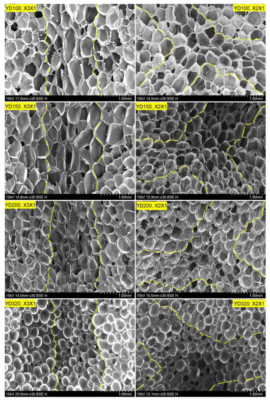 SEM micrographs of strand border and strand body in X3X1 plane and X2X1 plane for PET foam with four different densities. The cells between the yellow lines represent the strand border portion, while the remaining part is the strand body.