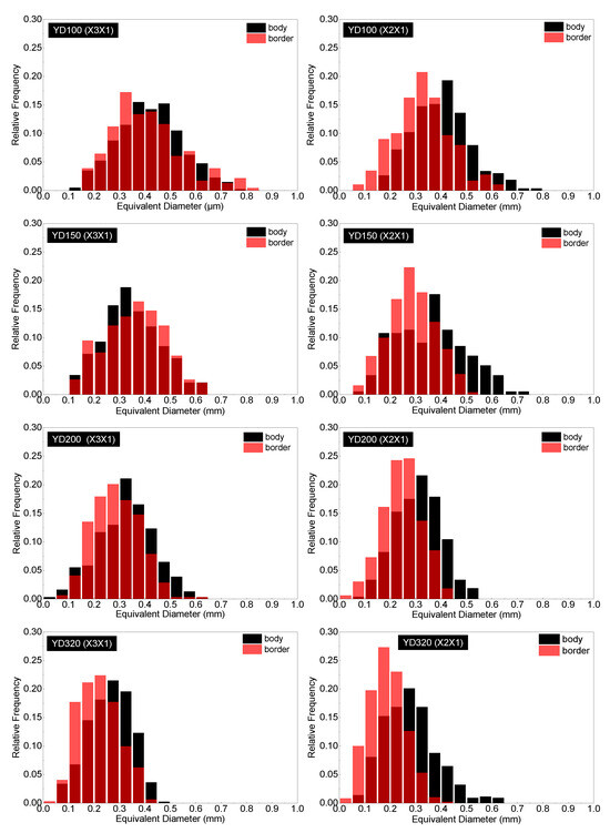 Cell equivalent diameter distributions in the strand border and strand body for YD100, YD150, YD200, and YD320 foam samples in the X3X1 and X2X1 planes. Red columns are cells in the strand border; black columns are cells in the strand body. The dark red are the overlap between the cell equivalent diameter distributions of the strand body and border.