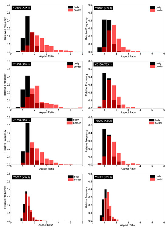 Aspect ratio distributions in the strand border and strand body for YD100, YD150, YD200, and YD320 foam samples in the X3X1 and X2X1 planes. Red columns are cells in the strand border; black columns are cells in the strand body. The dark red are the overlap between the aspect ratio distributions of the strand body and border.
