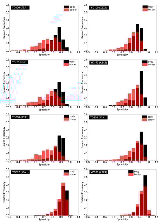 Sphericity distributions in the strand border and strand body for YD100, YD150, YD200, and YD320 foam samples in the X3X1 and X2X1 planes. Red columns are cells in the strand border; black columns are cells in the strand body. The dark red are the overlap between the sphericity distributions of the strand body and border.