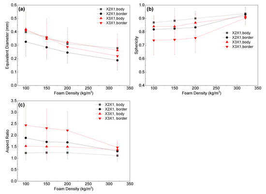 Foam structural features in the strand border and body: (a) Equivalent diameter vs. foam density, (b) sphericity vs. foam density, and (c) aspect ratio vs. foam density.