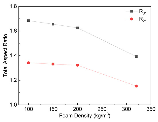 where the Rj1 is the total aspect ratio, j = 2, 3, af is the strand border area fraction of the strand, R1j1 is the aspect ratio of the strand border, and R2j1 is the aspect ratio of the strand body. The strand border area fraction is shown in Table 3, and the total aspect ratio is shown in Figure 10. The total aspect ratio in the X3X1 plane is 1.68, 1.66, 1.63, and 1.39 with increasing density, while the total aspect ratio in the X2X1 plane is 1.34, 1.33, 1.32, and 1.15 with increasing density. As the density of the foam increases, the total aspect ratio of both the X3X1 plane and the X2X1 plane decreases, and the total aspect ratio of X3X1 is greater than X2X1 at the same density. As shown in Figure 8 and Figure 9b, all the sphericities follow Weibull distribution in the strand body and strand border of the PET foam with four different densities [41]. Whether in the X3X1 plane or X2X1 plane, the cell sphericity in the strand body is greater than that in the strand border, while the distribution width is narrow. The sphericity increases with increasing density, meaning that the cells in the high-density foam are closer to spheres, which is consistent with the SEM analysis discussed above.